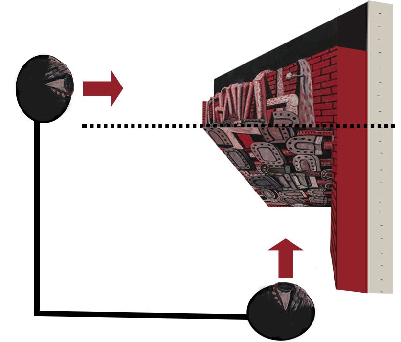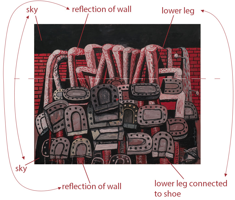 A second way to read the painting—the second painting—snaps into view. A mental view. To see this second painting, we must have already identified depictions in the first painting as particular instances of these concepts—horseshoe, shoe sole, shoe, foot, leg, knee. Then we can relate them, reorganizing them in light of their potential unity: in relation to a body, a leg is continuous with a foot that is sometimes in a shoe with a sole. With this unity in mind, we can reconnect the shoe soles in the foreground to the legs dangling over the wall by mentally flipping the bottom half of the canvas. Reorganized in the mind, the bottom half of the canvas can be seen as a view of the scene from another position, from underneath the legs hanging over the wall, as if the viewer could enter the scene in the first painting, lay on the ground with their head touching the brick wall to look up at the shoe soles of the shod feet connected to the dangling legs.